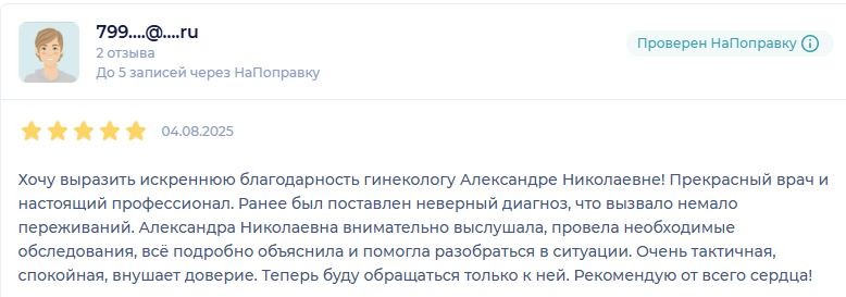 Балтрукова Александра Николаевна - кандидат медицинских наук. Акушер-гинеколог. Заведующая отделением гинекологии. Гинеколог-хирург. Стаж работы - более 10 лет