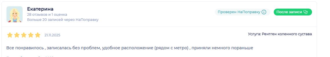 Хочу выразить благодарность клинике и рентген-лаборанту за профессионально проведенное исследование носовых пазух. Записалась без проблем, обслуживание на высшем уровне. Всё прошло быстро, четко и комфортно. Врач подробно все объяснил, атмосфера очень доброжелательная. Результат и снимок выдали практически сразу. Очень приятно, когда сталкиваешься с такой слаженной работой и внимательным отношением к пациенту. Однозначно рекомендую!